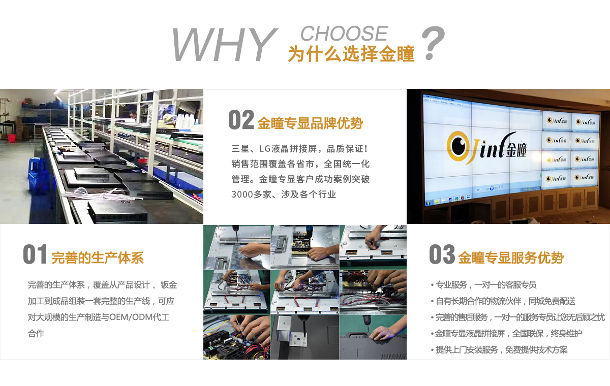 公司擁有多位有工程師認證資格和顯示設備行業多年研發經驗的資深研發團隊,具備強大的軟、硬件研發能力,致力于各種拼接屏的深度開發、生產和銷售。多年來已為不同行業企業用戶量身定制精彩合理的商用顯示解決方案,我們生產的拼接屏已廣泛應用于安防、教育、醫院、政府、公安、銀行、酒店、交通、樓宇、商場、影院、娛樂等事業單位。目前已成功服務15個細分行業,3000多個項目,是商用顯示系統解決方案供應商!
